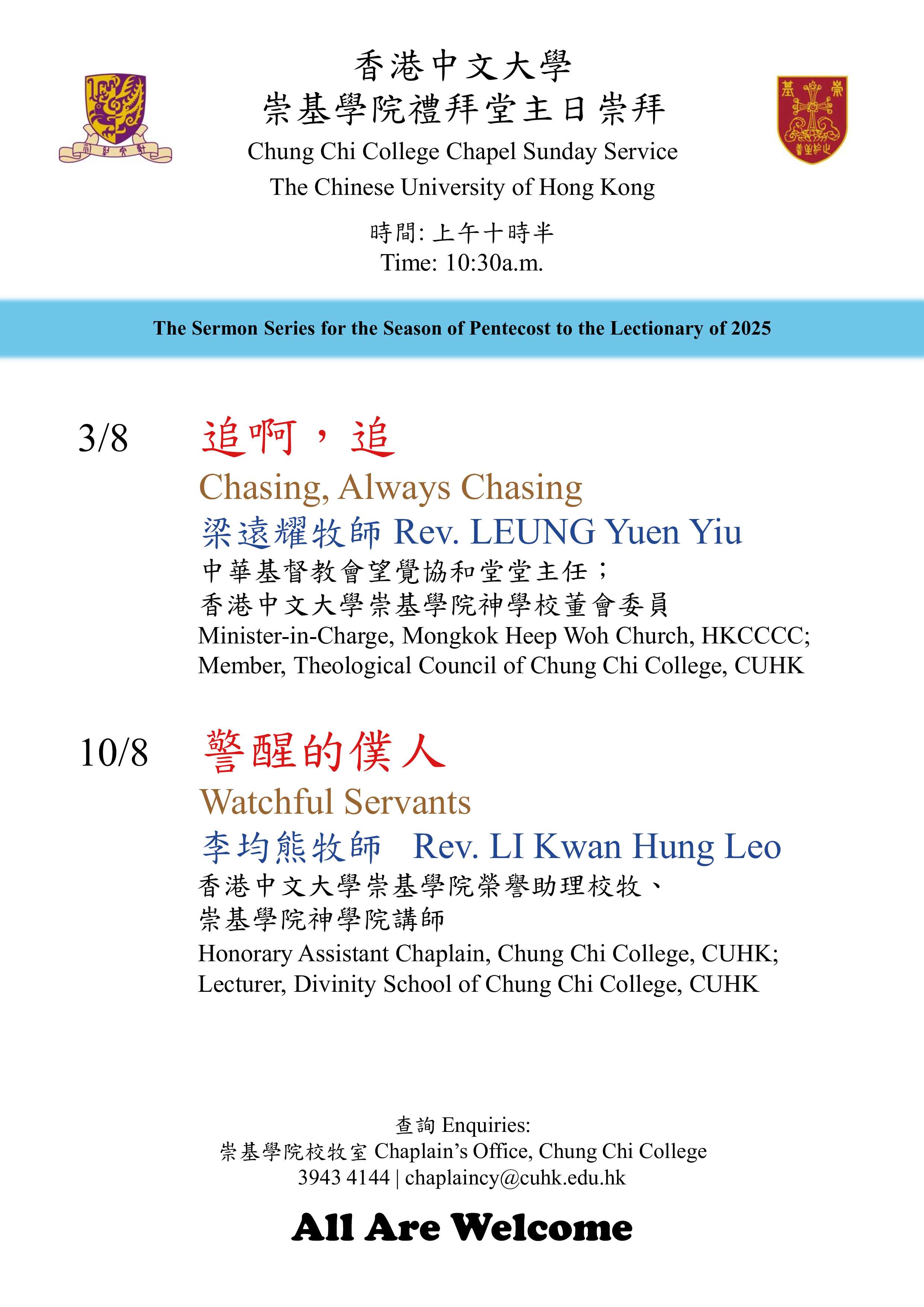 You are welcome to join the Sunday Service at Chung Chi College Chapel. It will be conducted in Cantonese, supported with Putonghua and English simultaneous interpretation service. Or you can view the live broadcast via the following channels:
