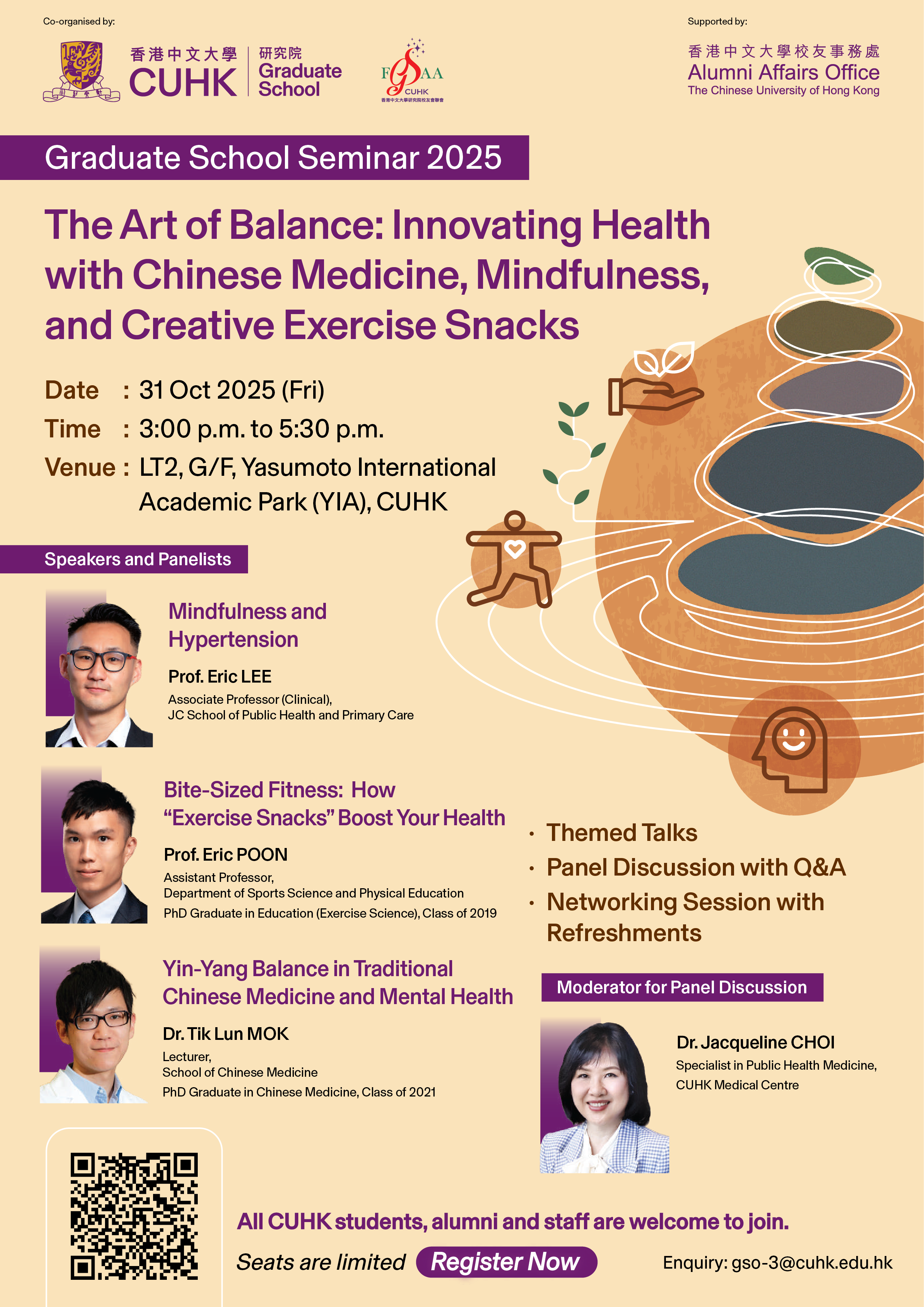 Don’t miss this unique opportunity to network and gain valuable insights from CUHK scholars and alumni. Join us to explore innovative, holistic approaches to health and well-being.