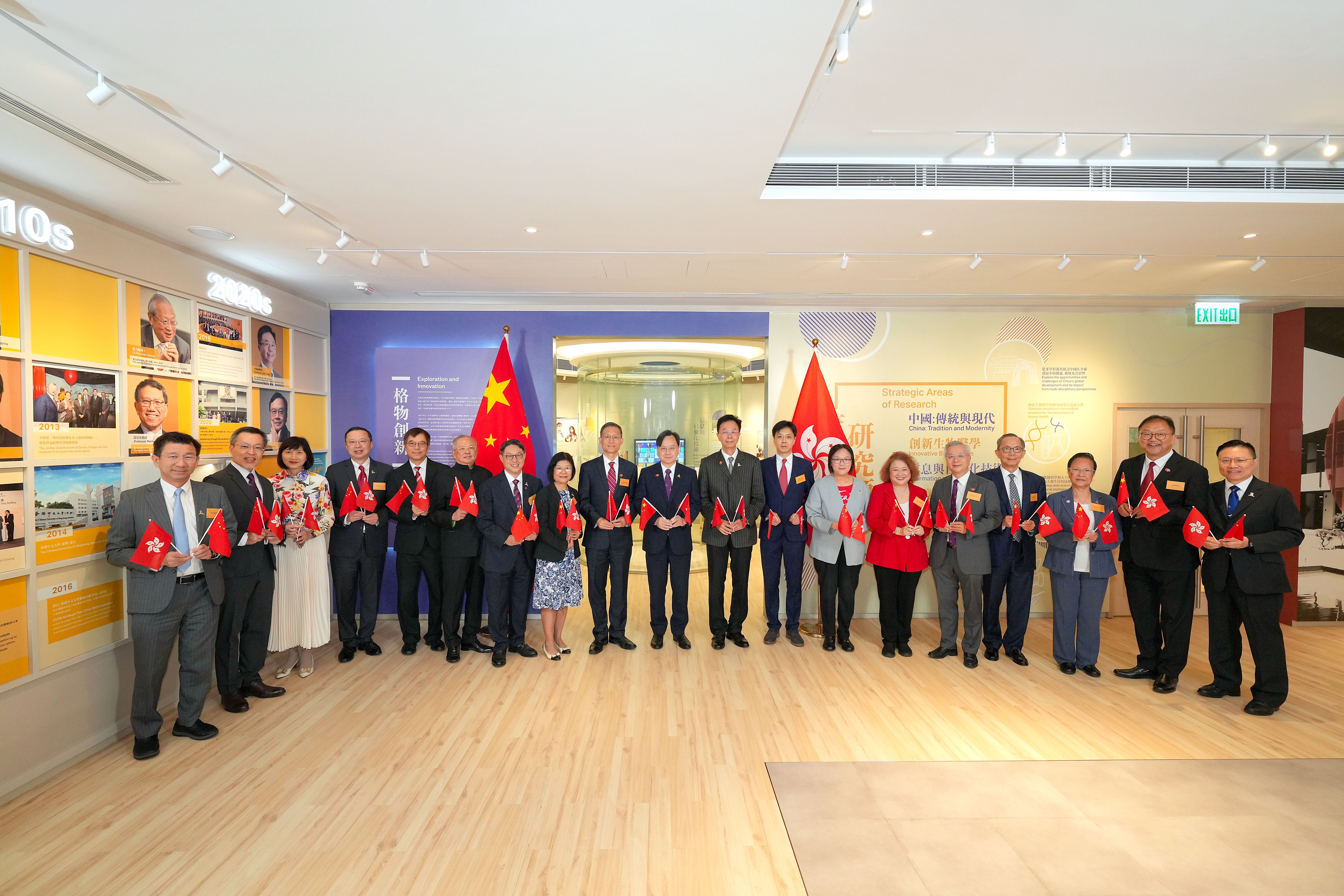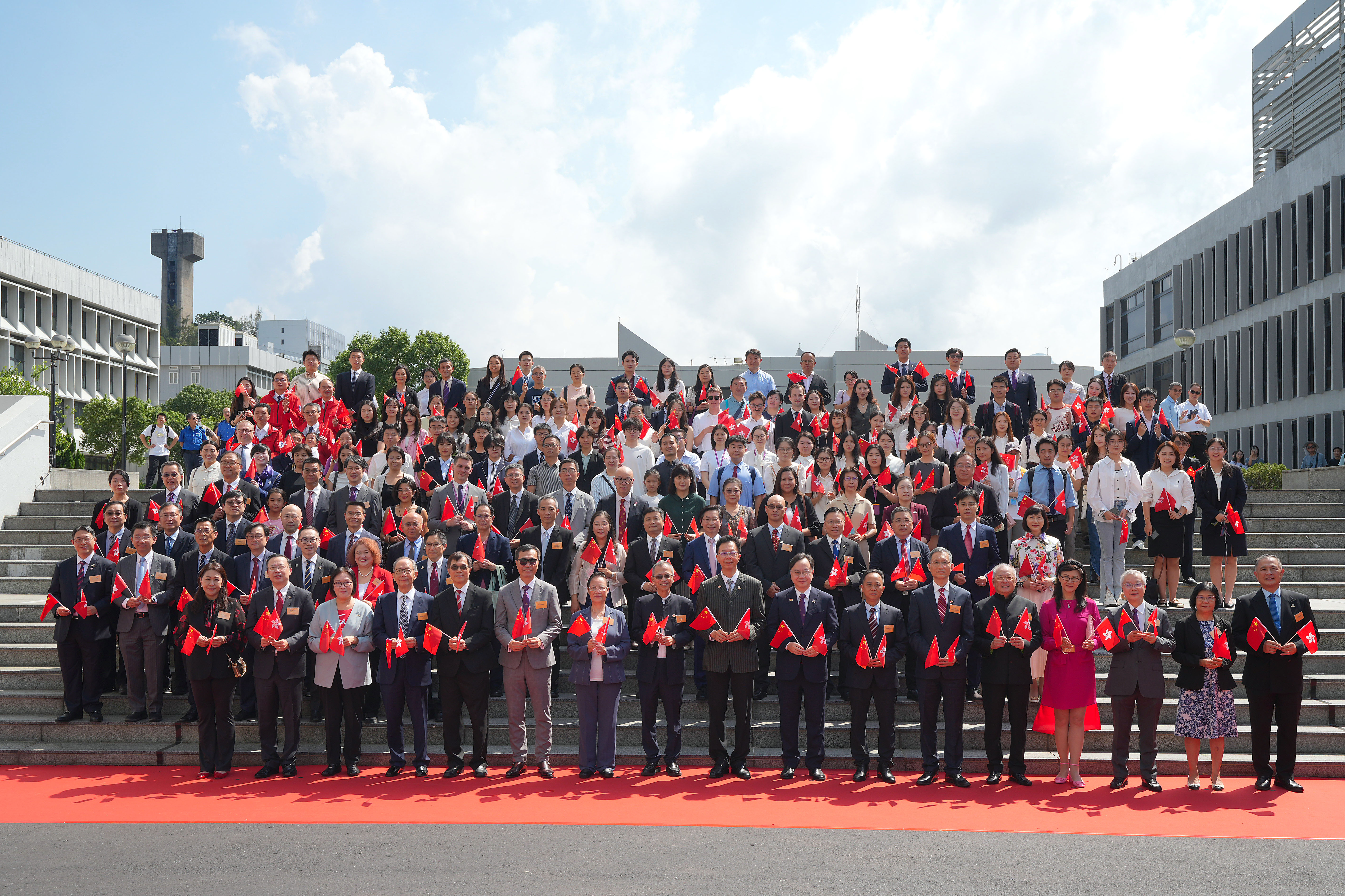 大學校董會主席查逸超教授及校長盧煜明教授主持典禮。中大很榮幸邀得中央人民政府駐香港特別行政區聯絡辦公室教育科技部葉水球副部長,以及中華人民共和國外交部駐香港特別行政區特派員公署領事部副主任田振峰參贊,與中大校董、教職員、學生、校友等約150位大學成員及友好出席升旗儀式。