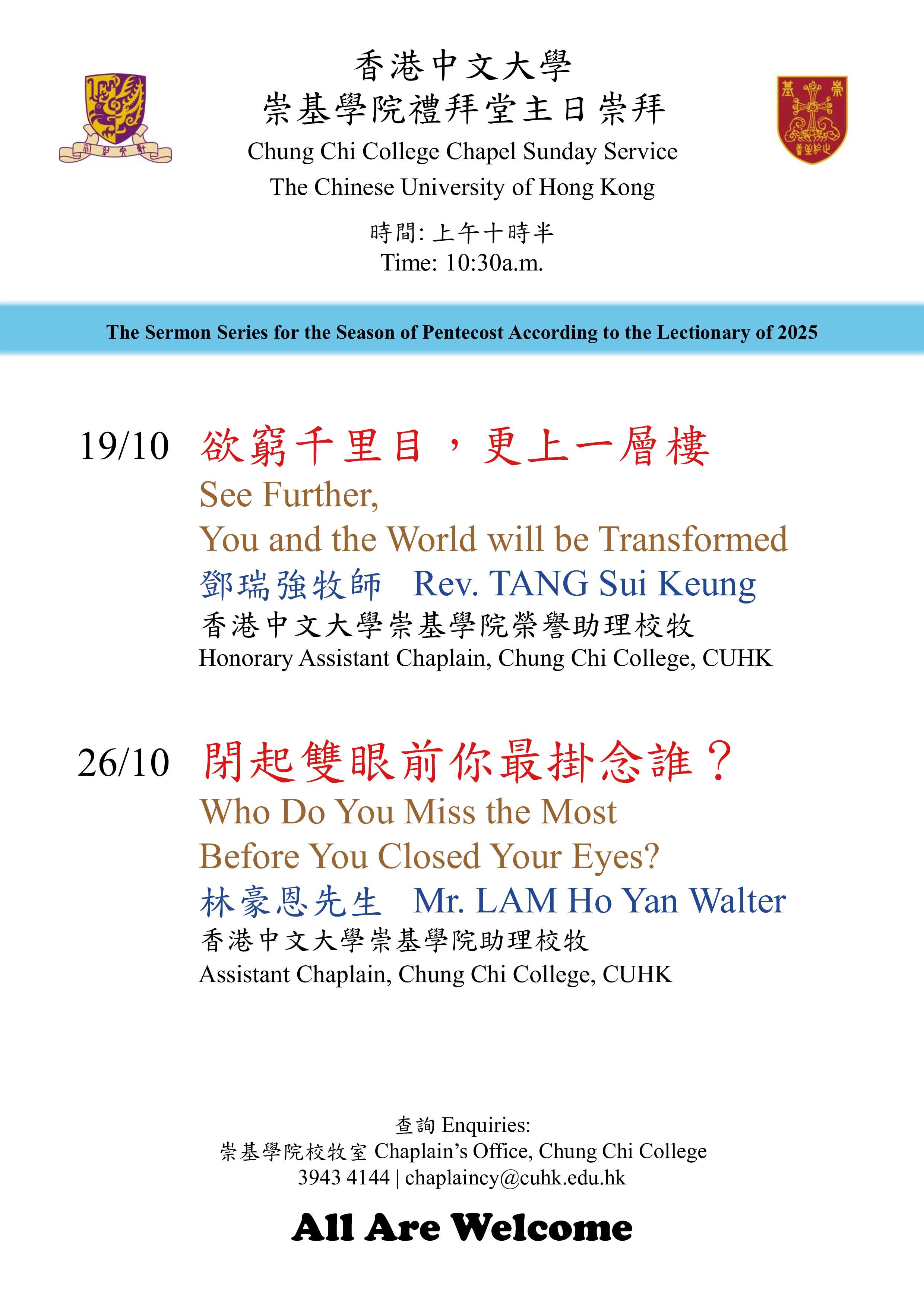 崇基學院校牧室 – 曾女士 3943 4144 或chaplaincy@cuhk.edu.hk